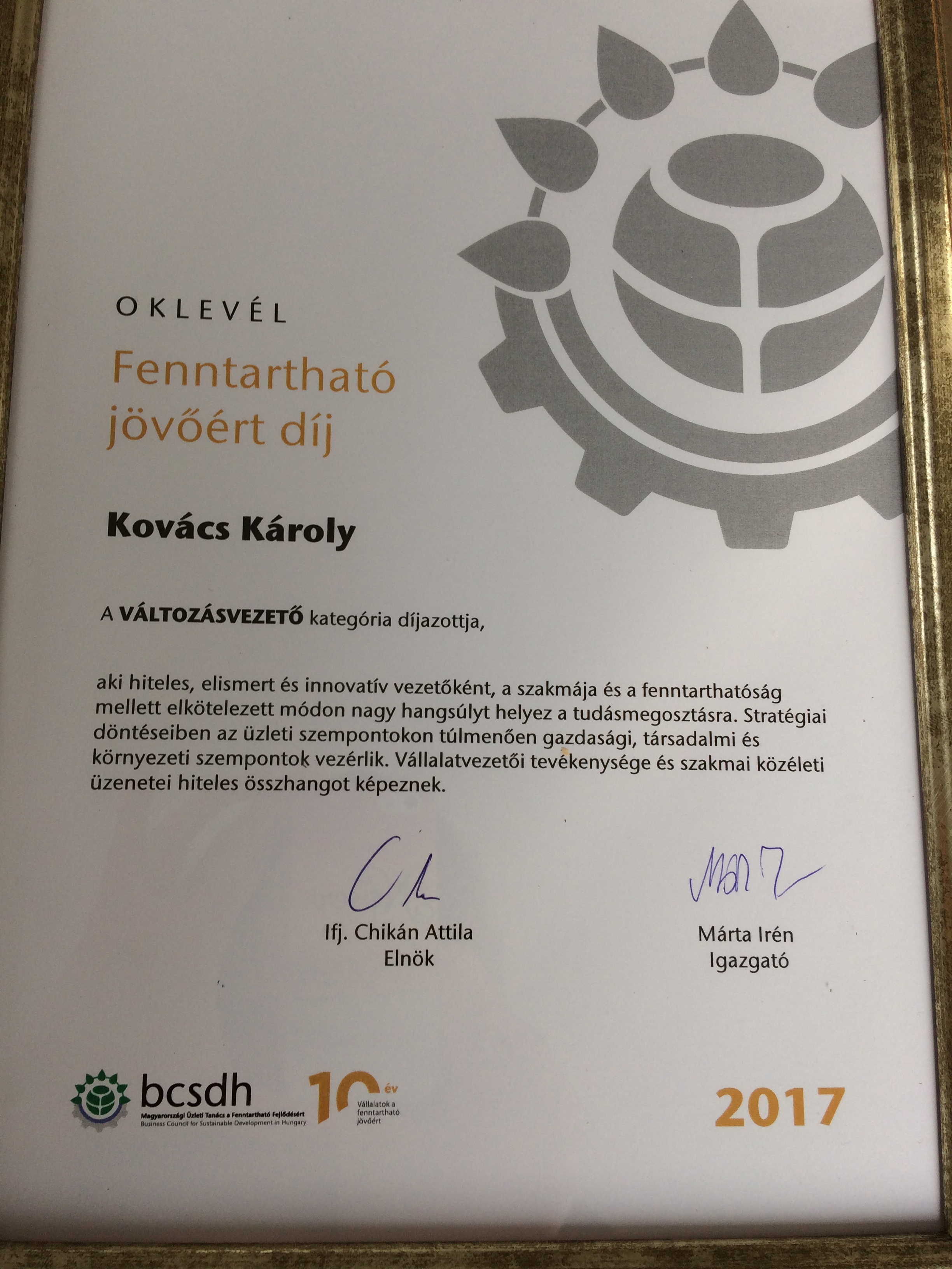 A díjat a szervezet vezetője, ifj. Chikán Attila elnök adta át, méltatásában kiemelte, hogy Kovács Károly, a BDL Kft. vezetője hiteles, elismert és innovatív vezetőként a szakmája és a fenntarthatóság mellett elkötelezett módon nagy hangsúlyt helyez a tudásmegosztásra. Stratégiai döntéseiben az üzleti szempontokon túlmenően gazdasági, társadalmi és környezeti szempontok vezérlik. Vállalatvezetői tevékenysége és szakmai közéleti üzenetei hiteles összhangot képeznek.